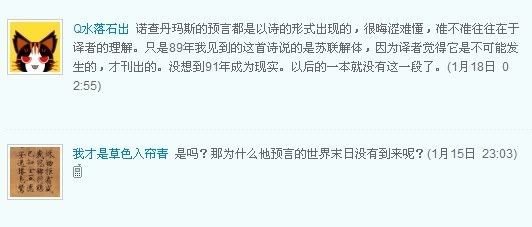@Q水落石出:想起诺查丹玛斯的预言。我在1989年夏天第一次看到这位400年前的法国大预言家的预言——也像大多数无神论者一样看看而已。两年后的“八一九”事件令我震撼——苏联解体了。因为那本小册子上就有苏联解体的预言。可能译者也认为不可能发生,才翻译出来,因为以后见到的译本都没有这条了。(1月15日 22:55 来自新浪微博)